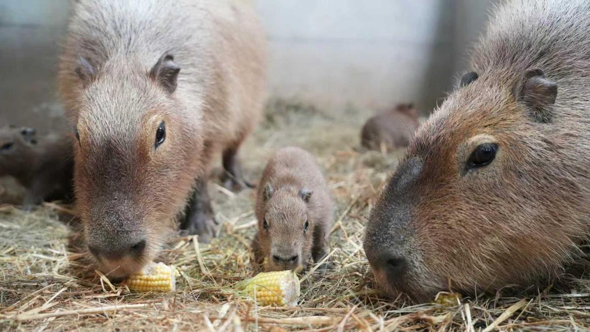 在动物幼儿园里,三只刚出生的水豚宝宝紧贴着妈妈。他们对世界充满好奇,时而惊奇地探索新环境,时而安静平静,吸引着众多游客驻足观看。