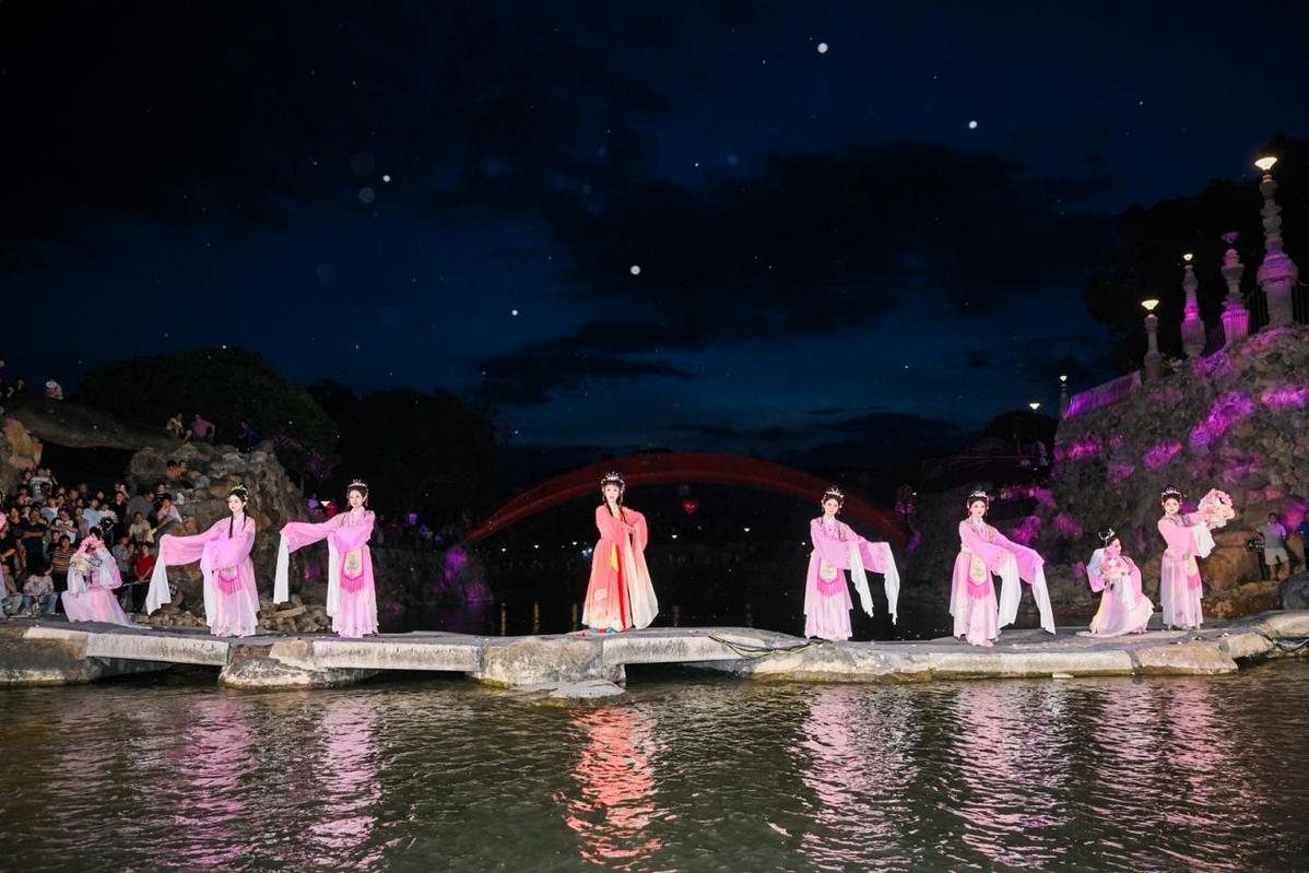 当中国谷的微风将水吹入jingu溪的河岸时,华丽的烟花反射了喜p桥上明亮的灯光,这是传统文化遗产和浪漫情绪表达的结合...